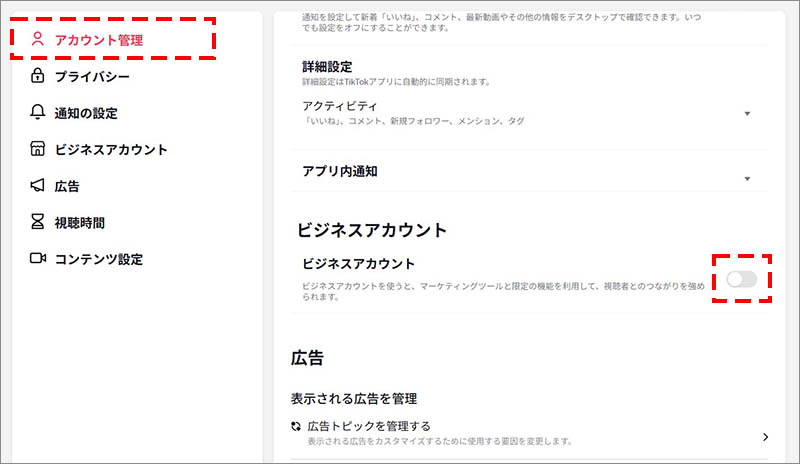 「アカウント管理」のメニュー内にある、「ビジネスアカウント」のスイッチをクリックして有効にします。