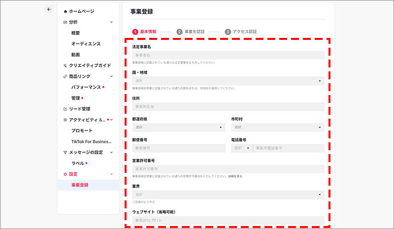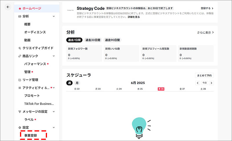 ビジネスアカウント(TikTok Business Suite)の管理画面が表示されます。続けて、「設定」の項目の中にある「事業登録」をクリックします。