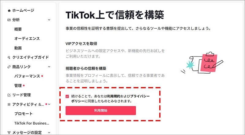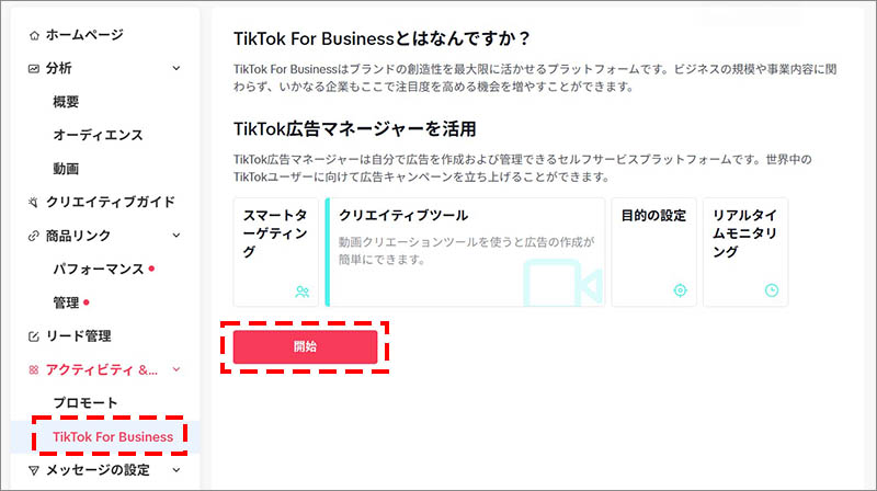 広告アカウントの開設が完了したら、ビジネスアカウント(TikTok Business Suite)と広告アカウントを連携します。ビジネスアカウント(TikTok Business Suite)の管理画面を開き、「アクティビティ&サポート」の項目の中にある「TikTok for Business」に進み、「開始」をクリックします。
