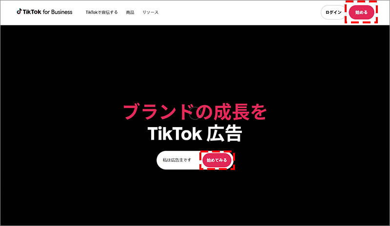 まず、TikTok for Business(TikTok広告マネージャー)の公式ウェブサイト(https://ads.tiktok.com)にアクセスし、「始める(始めてみる)」をクリックします。