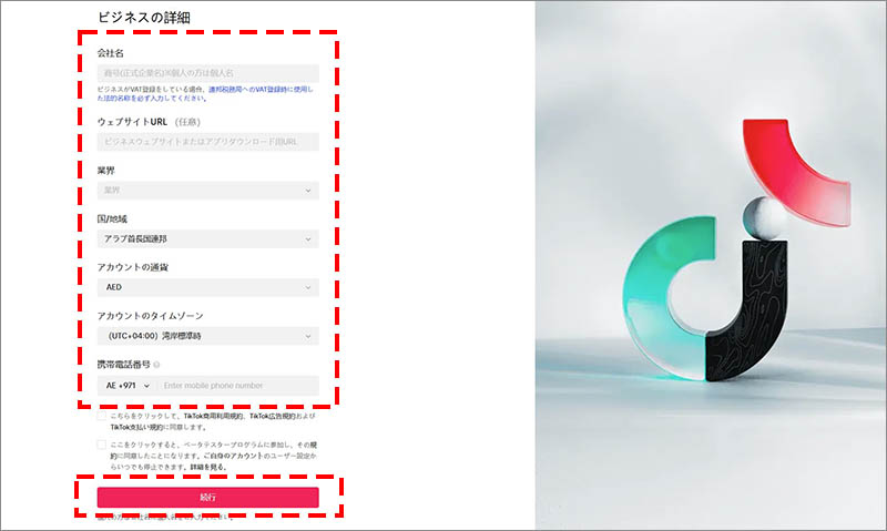 入力したメールアドレス、または電話番号で認証を行った後、ビジネスの詳細情報を入力して「続行」をクリックします。