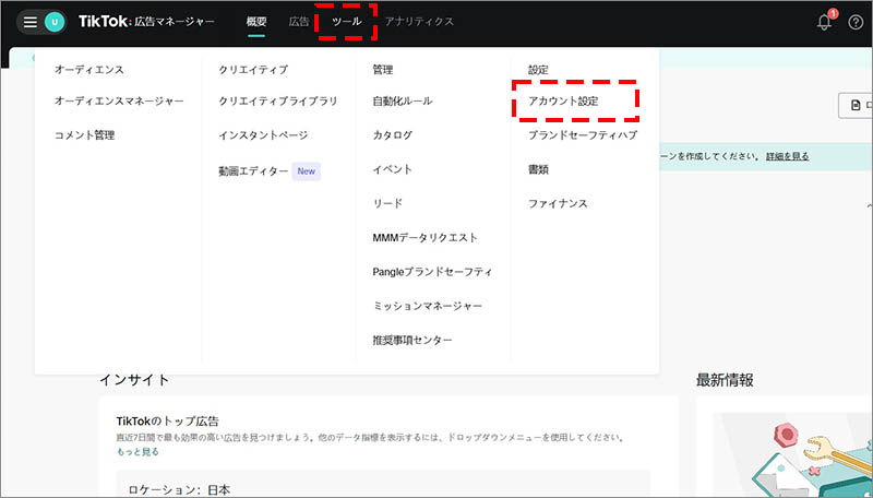 登録が完了すると、TikTok広告マネージャーの管理画面が表示されます。続けて、「ツール」から「アカウント設定」に進み、支払い情報、広告管理者の設定など、広告出稿に必要な各種設定を行います。