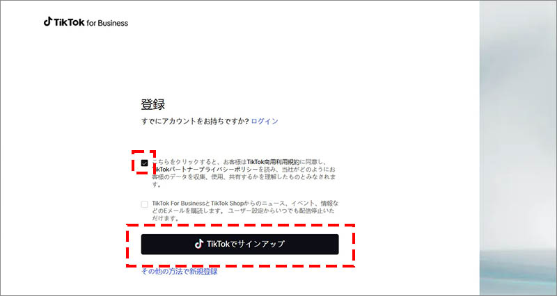 利用規約・プライバシーポリシーの同意にチェックを入れ、「TikTokでサインアップ」をクリックします。