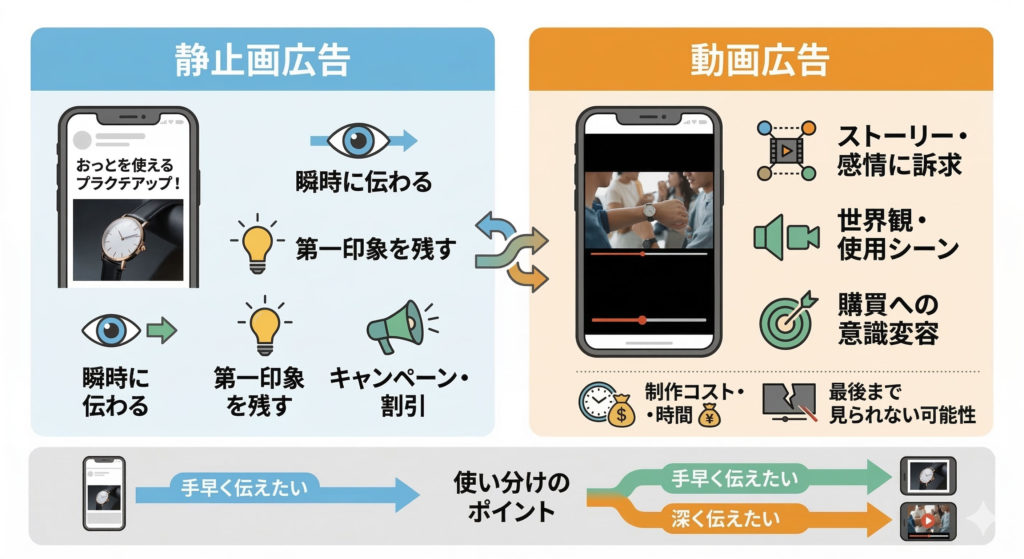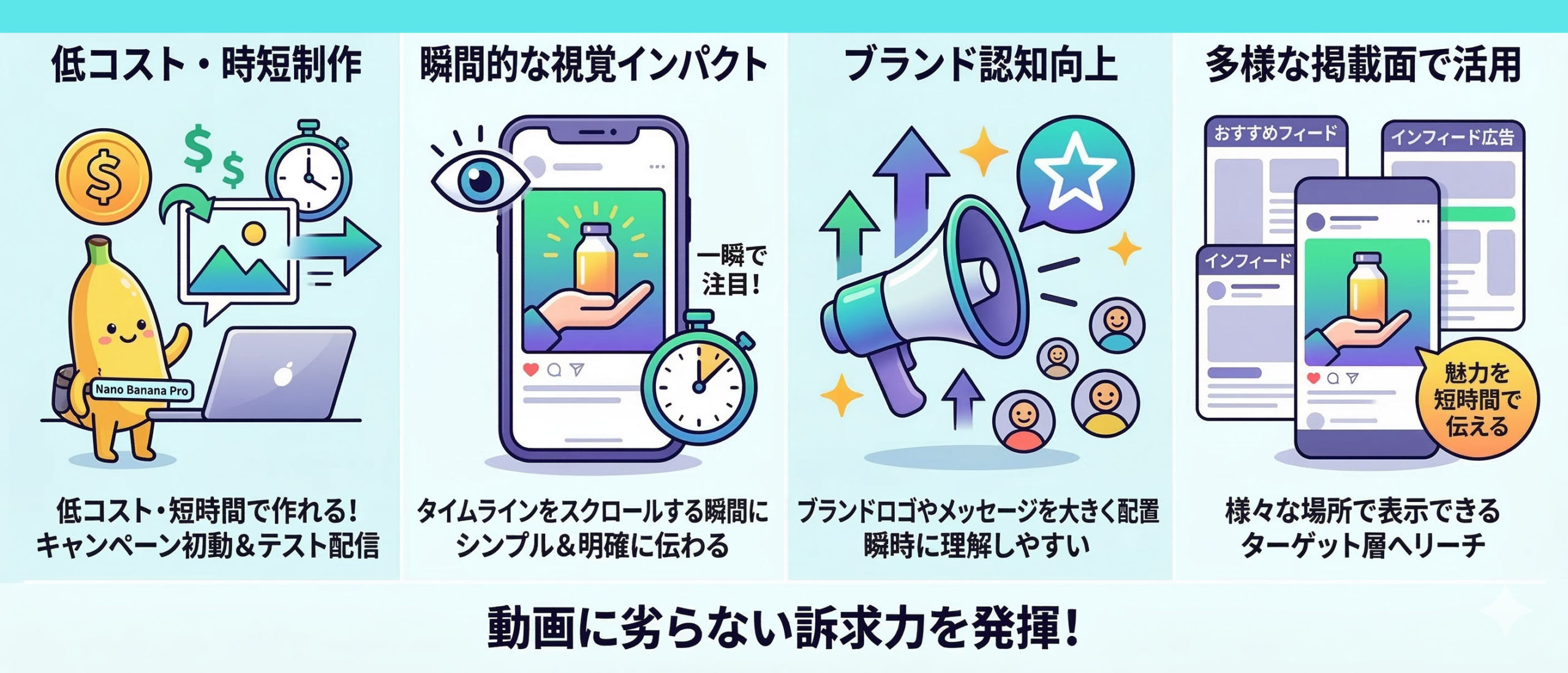 動画広告がストーリー性や感情的な訴求を得意とする一方で、静止画は瞬発力と視覚的なインパクトに優れています。