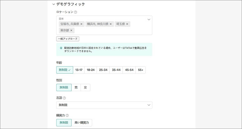 TikTokの広告マネージャーにログインし、「広告セット」作成の過程でターゲティングの各項目を設定します。