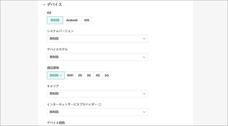 広告を表示するユーザーのデバイスの通信環境を、「無制限」「WIFI」「2G」「3G」「4G」「5G」の中から指定することができます。
