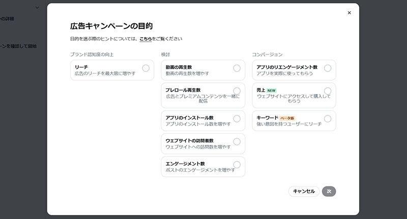 X 広告のキャンペーン目的は、「ブランド認知度の向上」「検討」「コンバージョン」という3つ分かれます。そこに、以下の9種類の目的が用意されています。