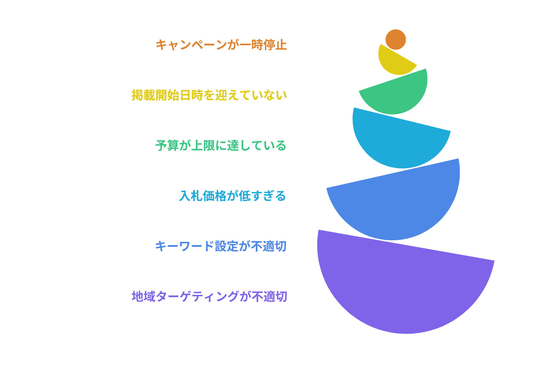 キャンペーンの1日あたりの予算が上限に達していたり、少ない予算を設定していると制限がかかるため、広告が表示されなくなります。この場合、予算を増額するか、配信スケジュールを見直すなどの対策を検討しましょう。