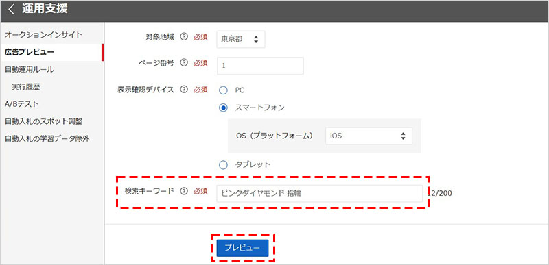 最後に、「検索キーワード」の項目に、広告の表示を確認したいキーワードを入力して、「プレビュー」をクリックします。