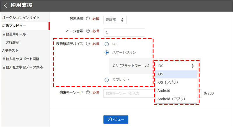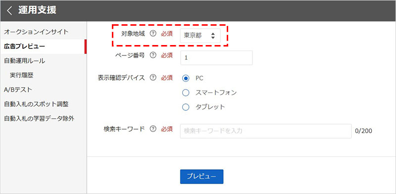 - 表示確認デバイス:PC、スマートフォン、タブレットなどデバイスを指定でき、デバイスごとに異なる広告表示を確認できます。