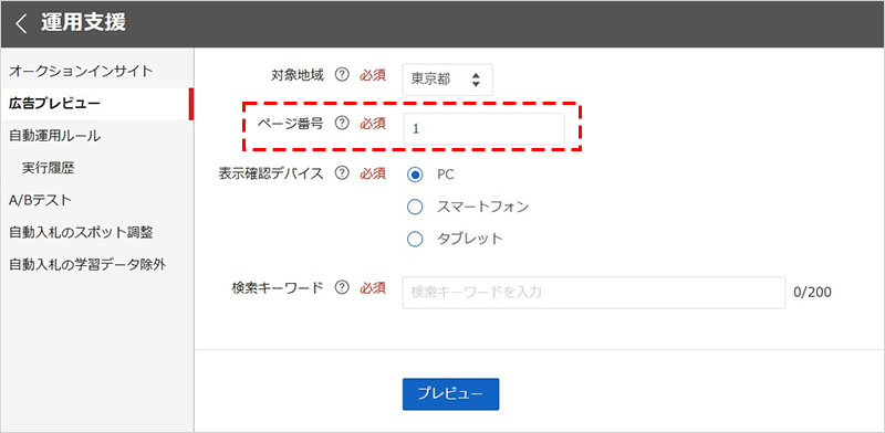 必要に応じて「ページ番号」を指定しますが、1ページ目でまずは確認して、対象の広告が表示されなかったら、2ページ目を次に指定して確認する流れが一般的です。