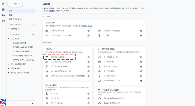 まず、Google アナリティクスのプロパティ設定を確認し、必要に応じて修正します。管理画面にアクセスし、左下の「管理」メニューから、「プロパティの詳細」を選択します。