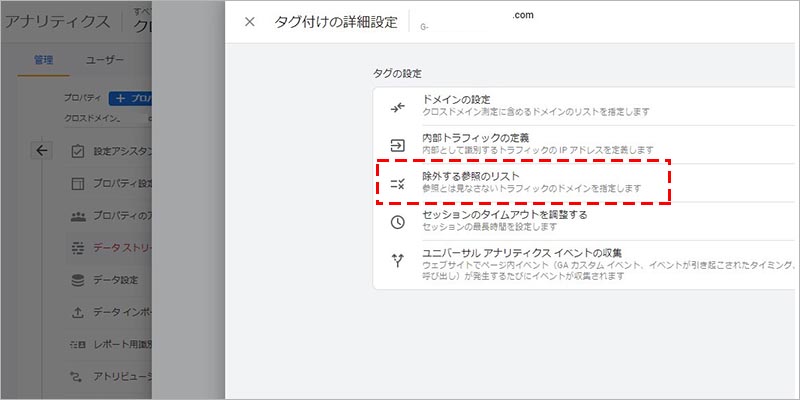 最後に、GA4 で参照元ドメインの除外設定を行います。