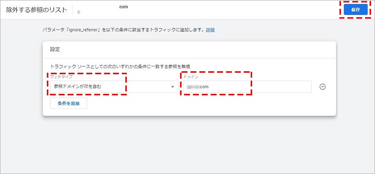 マッチタイプに「参照ドメインが次を含む」を選択し、ドメインにクロスドメイン設定したドメインを入力して、「保存」をクリックして完了です。※データストリームURLに設定しているメイン計測のドメインは自動で参照ドメインから除外されるため、追加したクロスドメインのみを登録します