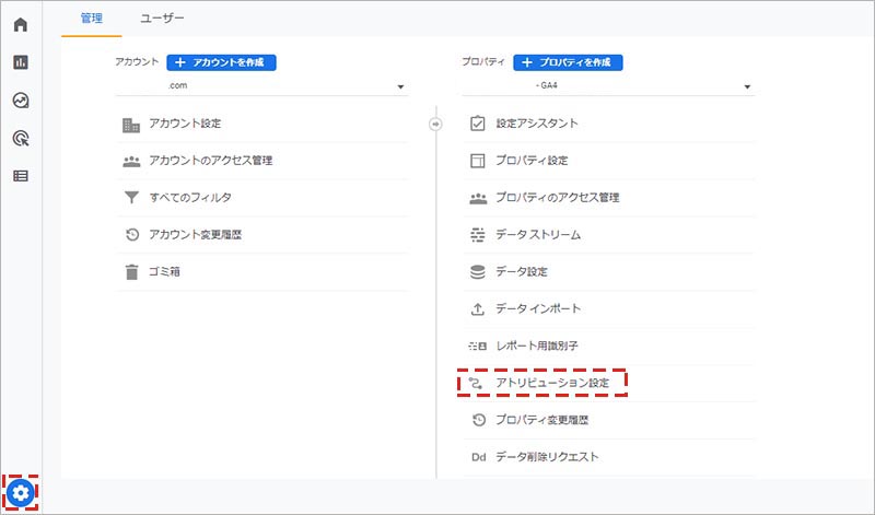 ルックバックウィンドウの設定を変更する場合は、左下の「管理」を選択し、プロパティ列の中にある「アトリビューション設定」をクリックします。