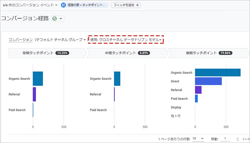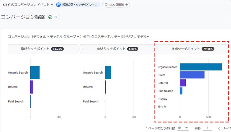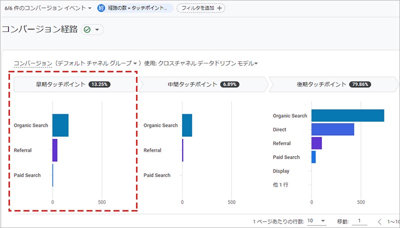 コンバージョン経路のタッチポイントの内、最初の25%のタッチポイントです。ただし、コンバージョン経路のタッチポイントが1つしかない場合、この「早期タッチポイント」のデータは空になります。