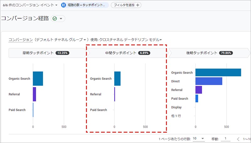 コンバージョン経路のタッチポイントの内、中間の50%のタッチポイントです。ただし、コンバージョン経路のタッチポイントが3つ未満の場合、この「中間タッチポイント」のデータは空になります。