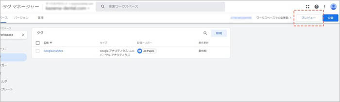 これで、Google Analytics が、全ページにて有効となるように設定出来ましたが、この状態ではまだタグは動きません。右上の「プレビュー」ボタンをクリックします。