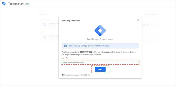「Tag Manager Preview Mode」が立ち上がるため、「URL」の欄に、Googleタグマネージャーのコードを仕込んだ対象サイトのURLを入力して、「Start」をクリックします。