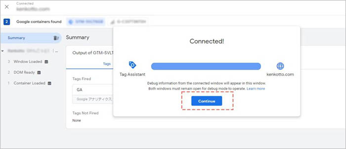 Tag Assistantの接続が始まり、しばらくすると対象サイトが別ウィンドウで立ち上がります。元のウィンドウに表示を切り替えて、「Continue」をクリックします。