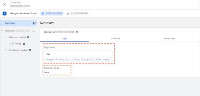 「Summary」に表示が切り替わります。「Output of GTM-※※※※※」の下部にある「Tag」が選択されている状態で、「Tags Fired」にGoogleAnalyticsのタグ(タグの設定時に入力した名称)が表示されていれば、問題なく発火しています(有効になっています)。