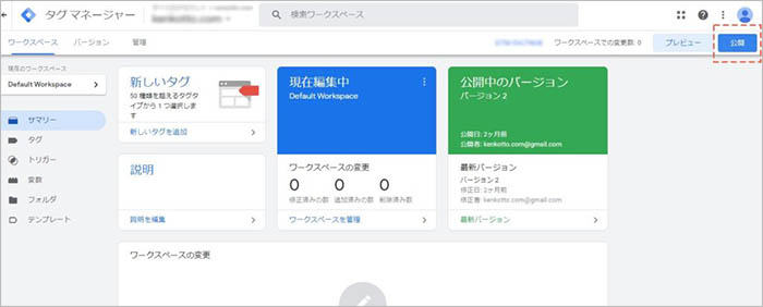 プレビューモードでタグの挙動を確認出来たら、Googleタグマネージャーの管理画面に戻り、右上の「公開」ボタンをクリックすることで、最終的に設定内容が本番に反映される。という流れになっています。