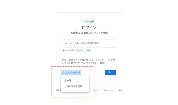 Googleアカウント自体がない場合は、Googleアカウントを新しく発行してください。(この記事では、後にGoogleタグマネージャーを使って、GoogleAnalyticsのタグを設置する手順を説明しますので、新規の場合はGoogleAnalyticsのアカウントも発行してください)