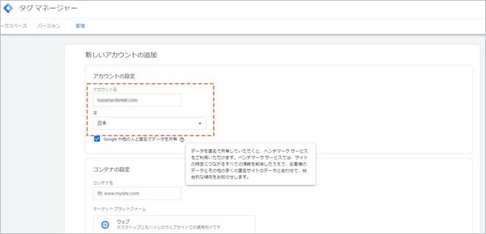 「アカウント名」に対象サイトのURLなど、分かりやすい名称を記載し、「国」のプルダウンで「日本」を選択します。
