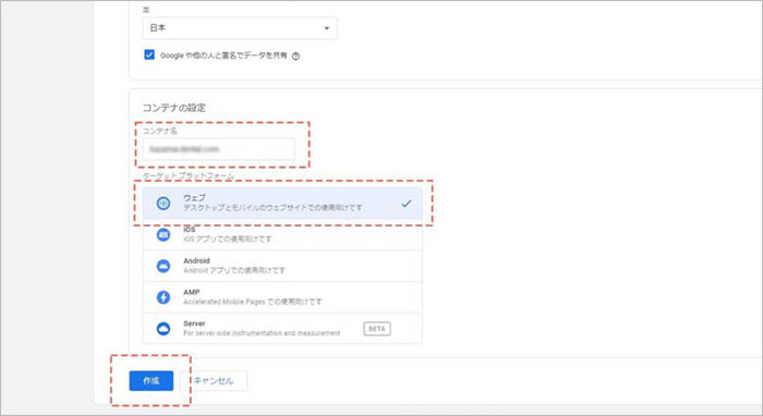 「コンテナ名」に対象サイトのURLなど、分かりやすい名称を記載し、「ターゲット プラットフォーム」で「ウェブ」を選択し、「作成」をクリックします。