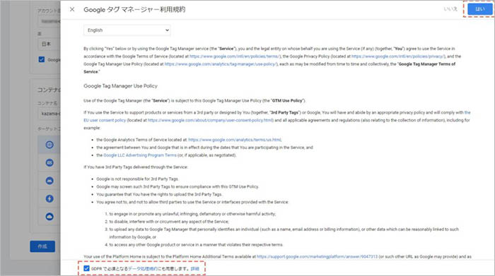 利用規約がポップアップで開くため、「GDPR で必須となるデータ処理規約にも同意します。( I also accept the Data Processing Terms as required by GDPR.)」のチェックボックスにチェックを入れ、「はい(Yes)」をクリックします。