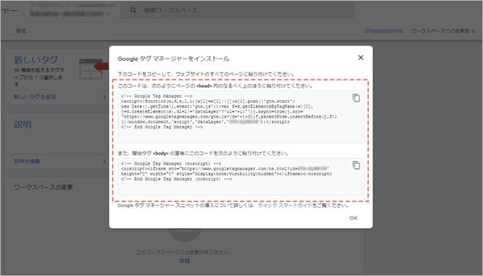 これでGoogleタグマネージャーのアカウントが開設されました。Google タグ マネージャーをインストールするための2種類のコードが表示されるため、このコードをコピーして、 【A】を対象サイトの<head>タグ 内のなるべく上と、【B】を対象サイトの<body> タグの直後に貼り付けたら、「OK」をクリックします。