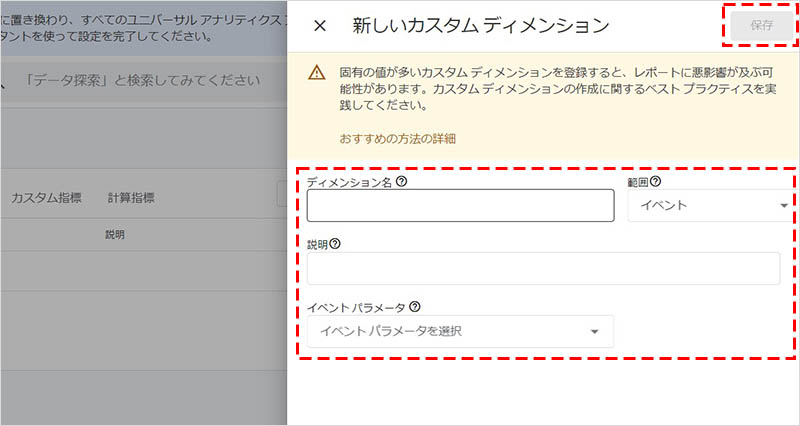 「ディメンション名」に percent_scrolled と入力し、「範囲」にイベントを選択、「説明」に スクロール率 と入力し、「イベントパラメータ」に percent_scrolled を選択し、「保存」をクリックします。