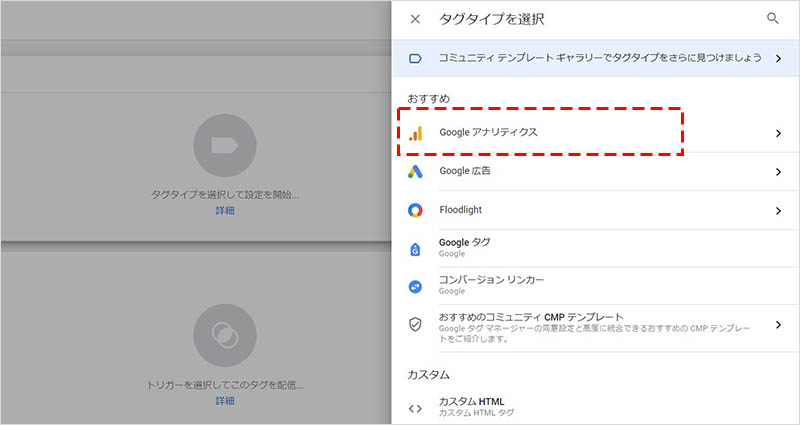 「タグタイプを選択」 というポップアップが表示されるので、「Google アナリティクス」 をクリックします。