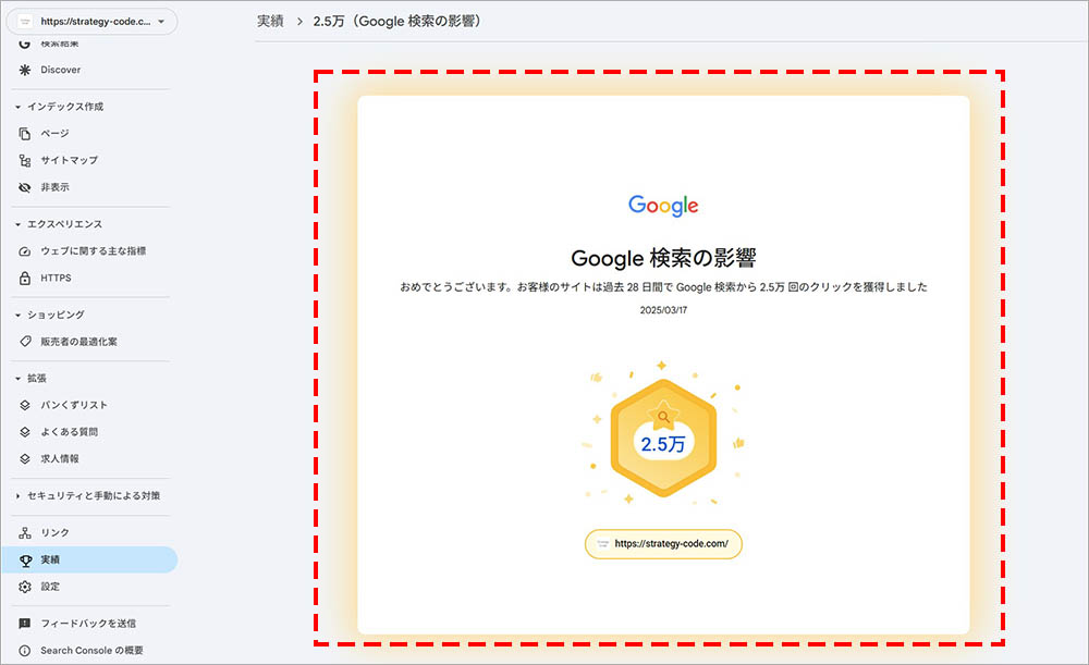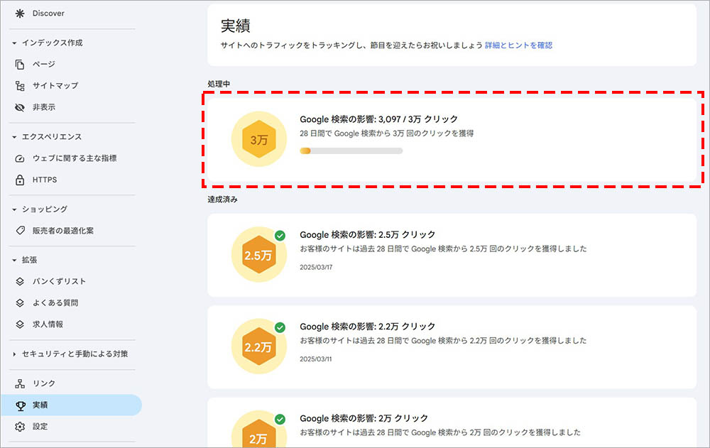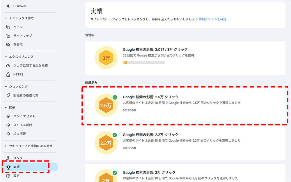 実績レポートの確認するにはまず、Google Search Console にログインして、左側のメニューの中にある、「実績」をクリックします。右側に「処理中」と「達成済み」の実績が一覧で表示されます。達成済みのバッチをクリックします。