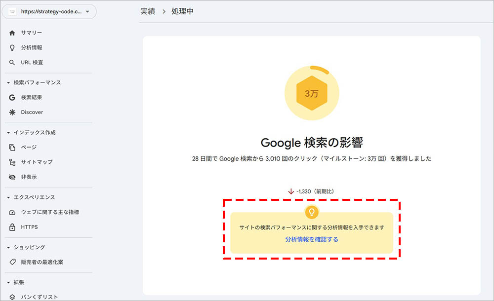 先ほどとは異なり、「サイトの検索パフォーマンスに関する分析情報を入手できます」という表記と共に、「分析情報を確認する」というリンクが表示されるので、そのテキストリンクをクリックしてみましょう。