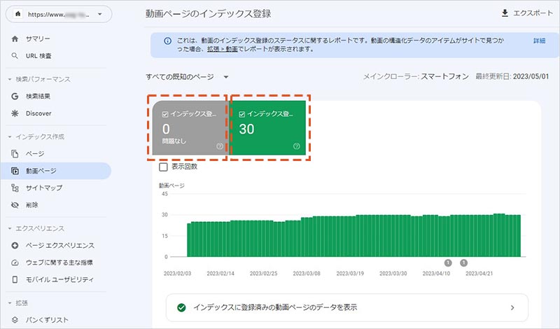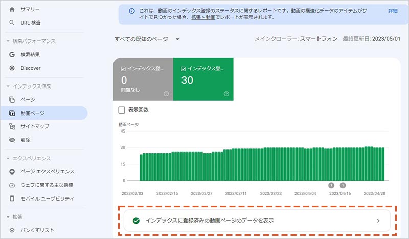 インデックスに登録された動画を含むインデックス登録済みページの URL は、「インデックスに登録済みの動画ページのデータを表示」をクリックします。