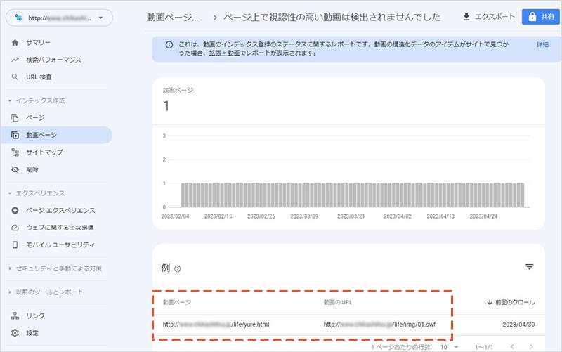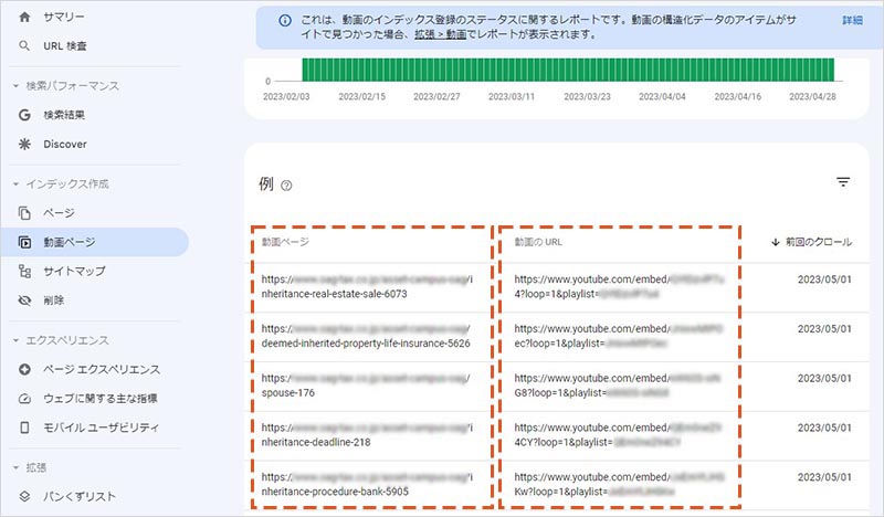 グラフの下部に「例」の表が表示されます。「動画ページ」の列に、インデックス登録済みのページ URL が表示され、「動画の URL 」の列に、そのインデックス登録済みページ内に含まれるインデックス登録された動画の URL が表示されます。