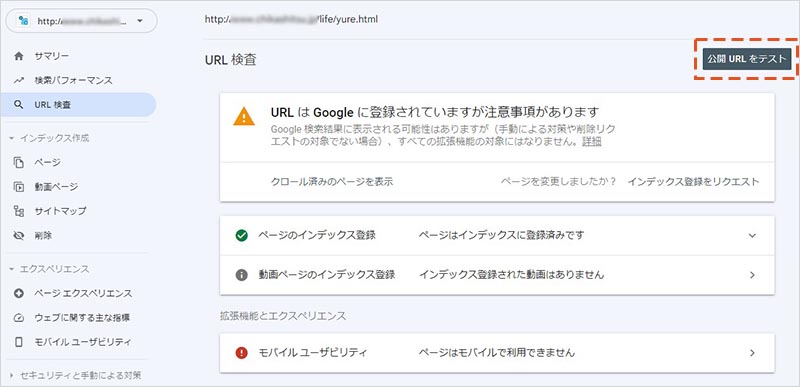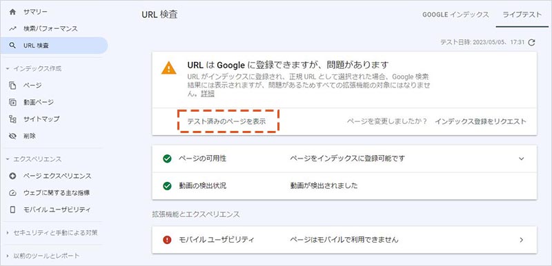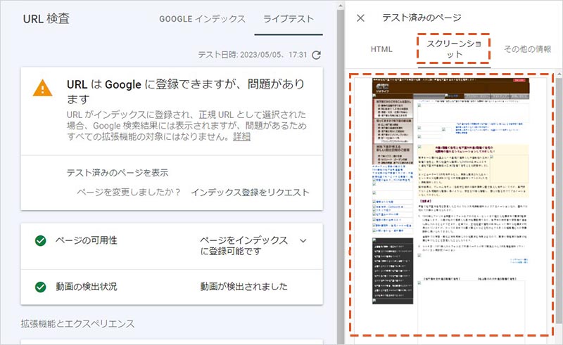 特に重要なのは、ファーストビュー内で動画が見えることです。Google がどのようにページを認識しているかは、以下の流れで、「URL 検査」ツールから「公開 URL のテスト」を行い、テスト済みのページの「スクリーンショット」から確認することができます。
