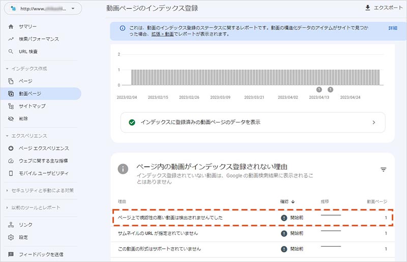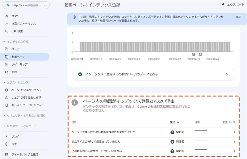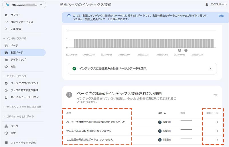 インデックス登録されていない動画を含むインデックス登録済みページは、グラフ下部の「ページ内の動画がインデックス登録されない理由」の欄を確認します。