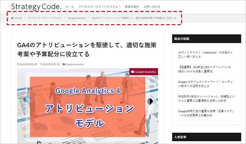 例えば、当記事のページをパス型パンくずリストを使用した場合の表示は、” strategy-code.com > marketing-colum > seo > breadcrumbs-of-website ” このようになります。