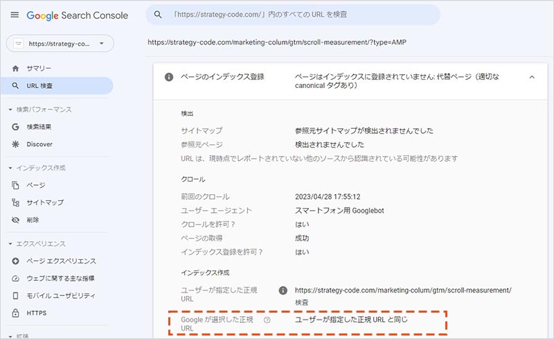 canonical で指定した正規 URL を Google も正規 URL と判断した場合は、「ユーザーが指定した正規 URL と同じ」と表示されます。