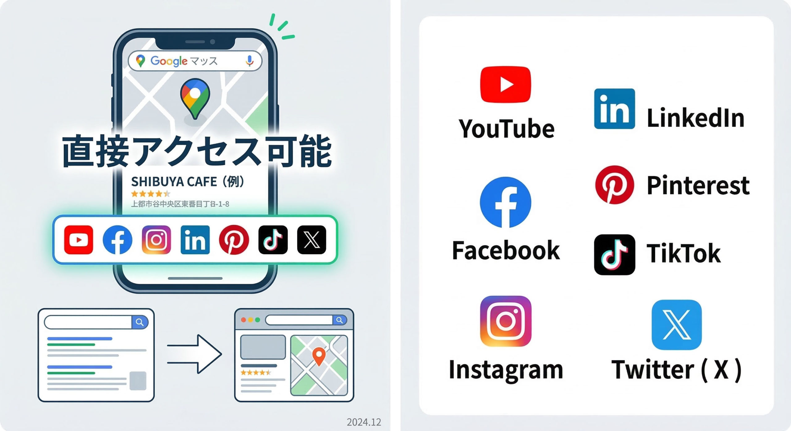 Google ビジネスプロフィールに SNS を関連付けることで、検索エンジンの結果ページから直接 SNS にアクセスできるようになり、ユーザーとの接点が増えるだけでなく、認知度や信頼性の向上にも繋がります。