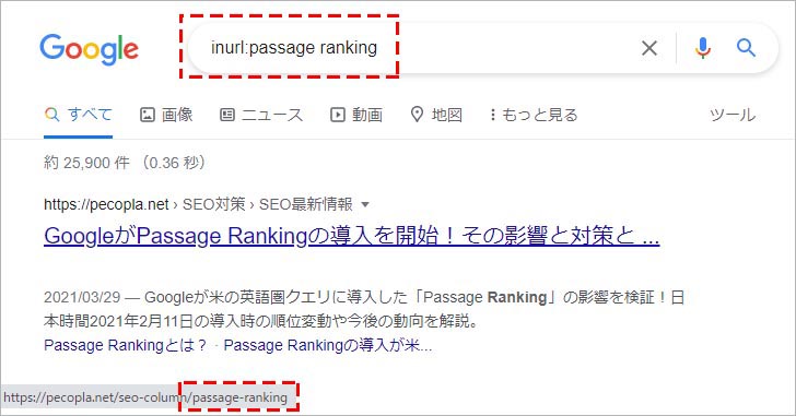 「inurl:」検索コマンドは、特定のワードが URL の中に含まれるインデックスページを調査したいときに使用します。