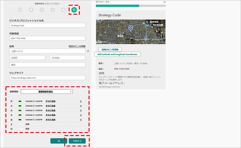 営業時間の編集画面に切り替えて、営業時間を入力します。最後に、「参加する」をクリックして、申請は完了です。