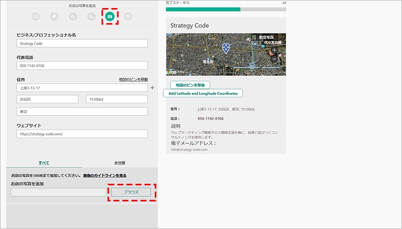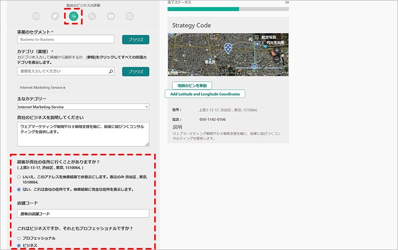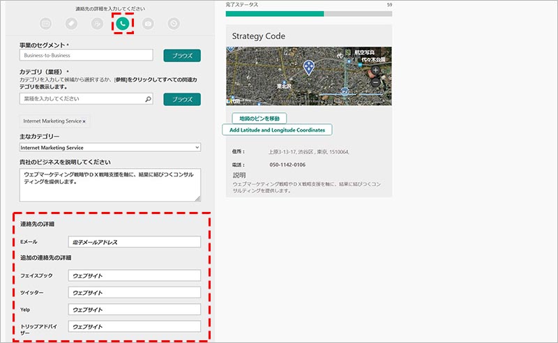 基本情報(ビジネス名・電話番号・住所・ウェブサイト・地図のピンの位置)を入力・調整します。