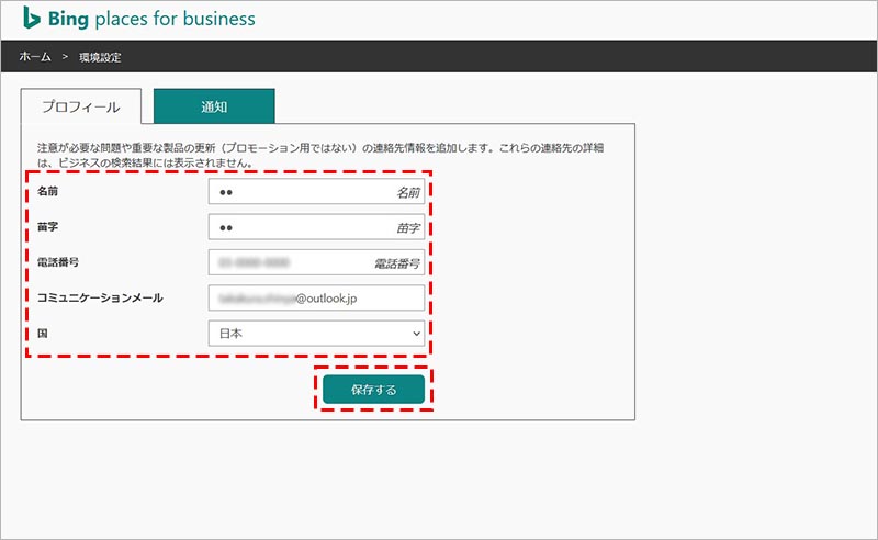連絡先情報を入力して、「保存する」をクリックします。