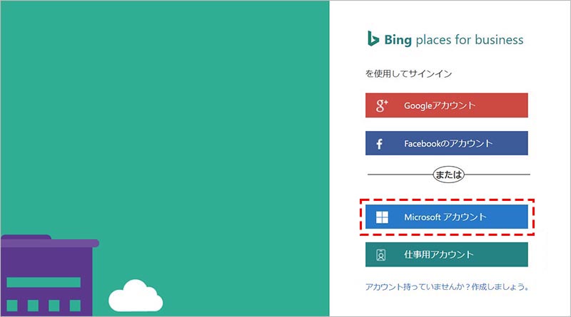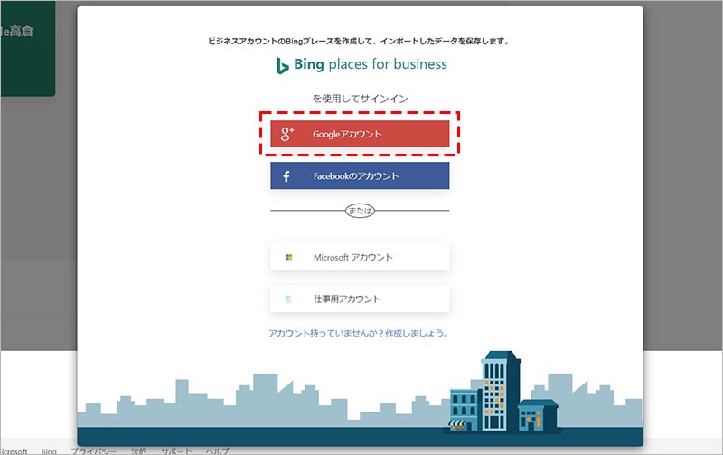 Bing Places for business にサインインするアカウントを「 Google アカウント」「 Facebook のアカウント」「 Microsoft アカウント」「仕事用アカウント」の中から選択します。