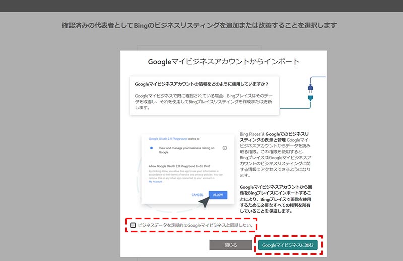 「 Google マイビジネスに進む」をクリックします。(同期させたい場合は、「ビジネスデータを定期的に Google マイビジネスと同期したい。」にチェックを入れて、読み込む頻度を選択します)