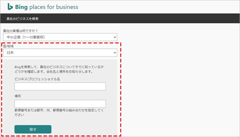 「国/地域」に日本を選択し、ビジネス名(施設名)と住所または郵便番号を入力して、「探す」をクリックします。( Bing マップに既にビジネス情報が登録されていないか確認します)