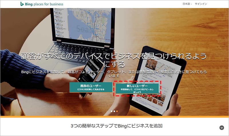 まず、Bing Places for business にアクセスし、「新しいユーザー」をクリックします。